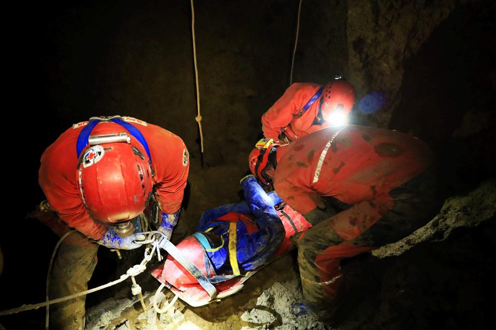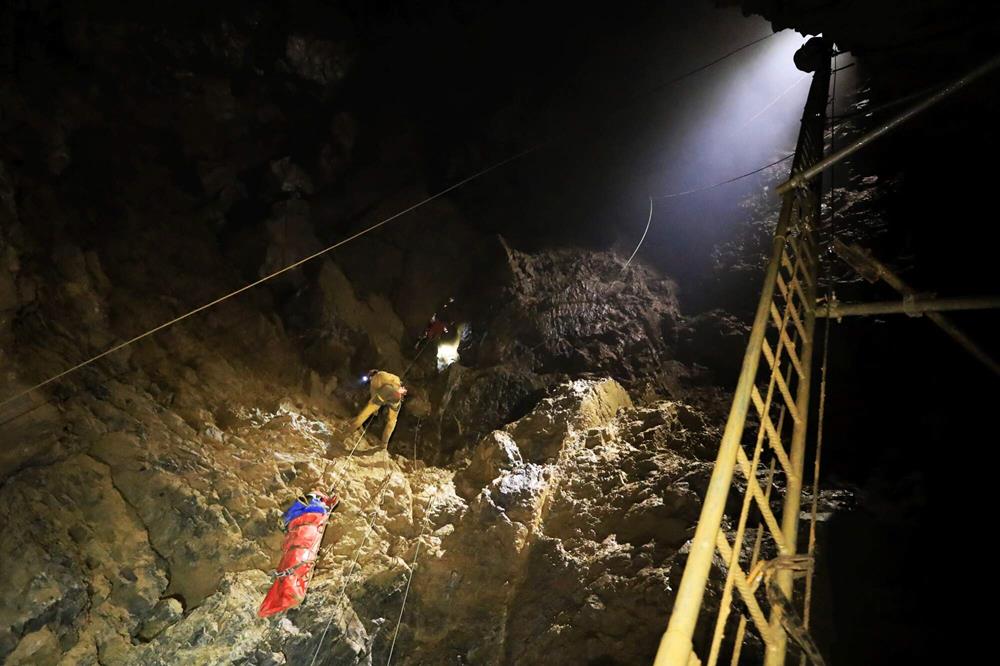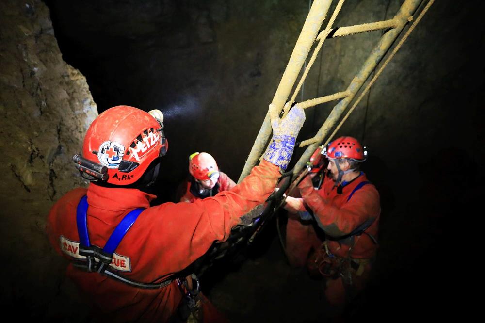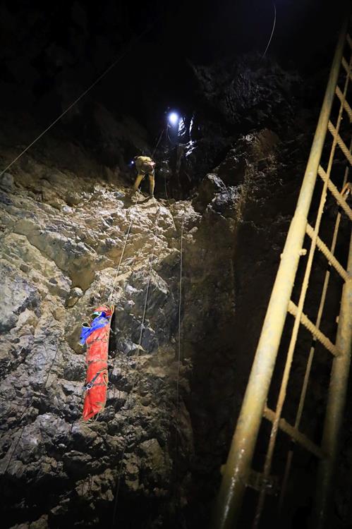 Pro transport figurantů z daných bodů v podzemí, pro úzké pasáže, byl též použit záchranářský trojúhelník. Vzhledem k povahám zranění u figurantů nebylo využito tepelného bodu, ale byli voleny přímé transporty na povrch.