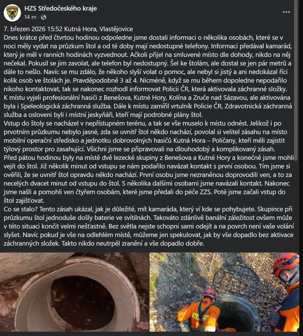 V odpoledních hodinách 7.3. 2026 byla na výzvu HZS aktivována SZS s žádostí o pomoc při vyhledání pohřešovaných osob v důlním díle u Vlastějovic v okrese Kutná Hora.